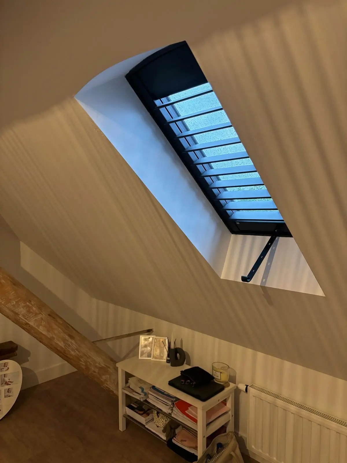 De shutters zijn uitgevoerd in de kleur zwart RAL 9005, gelijk aan onze stalen dakramen.